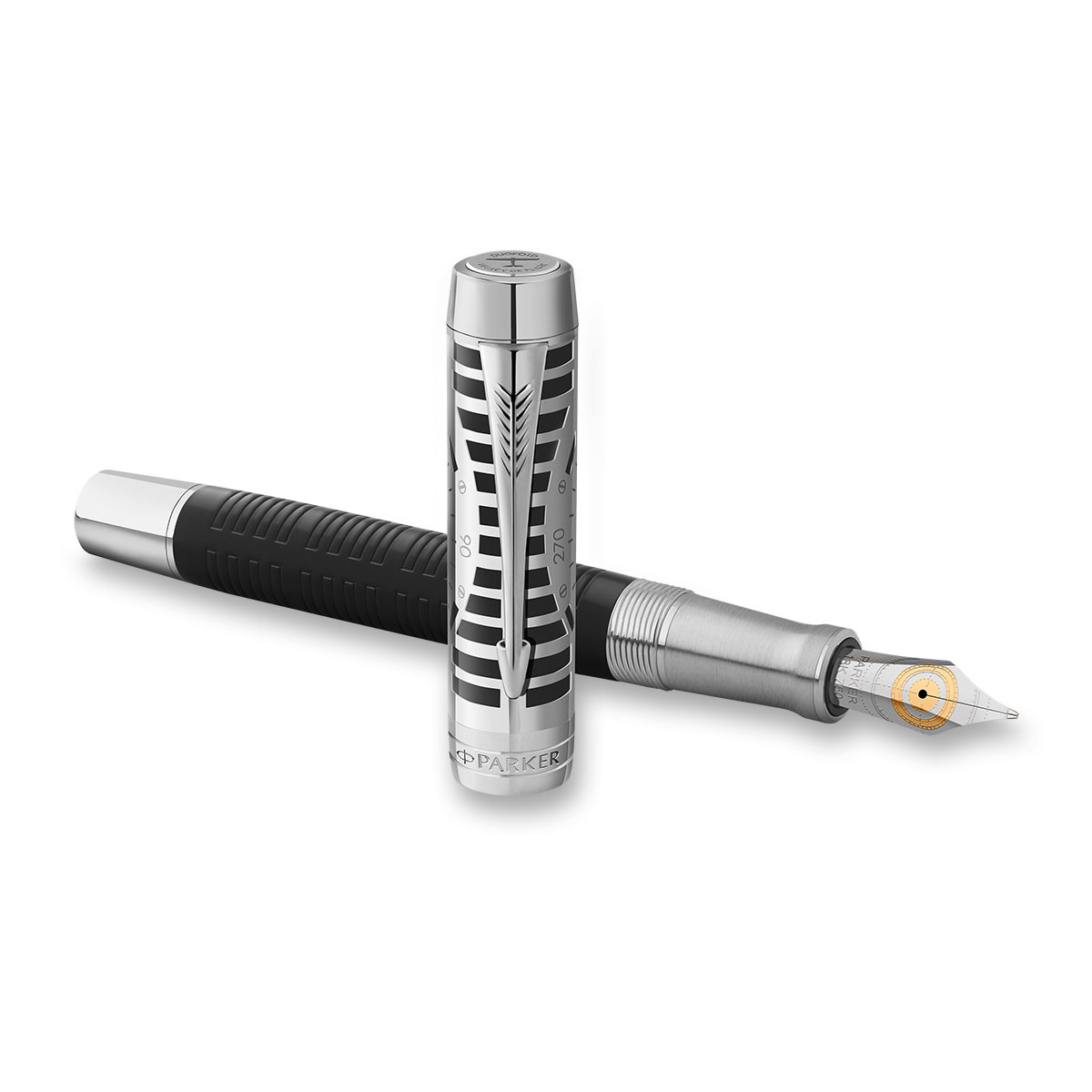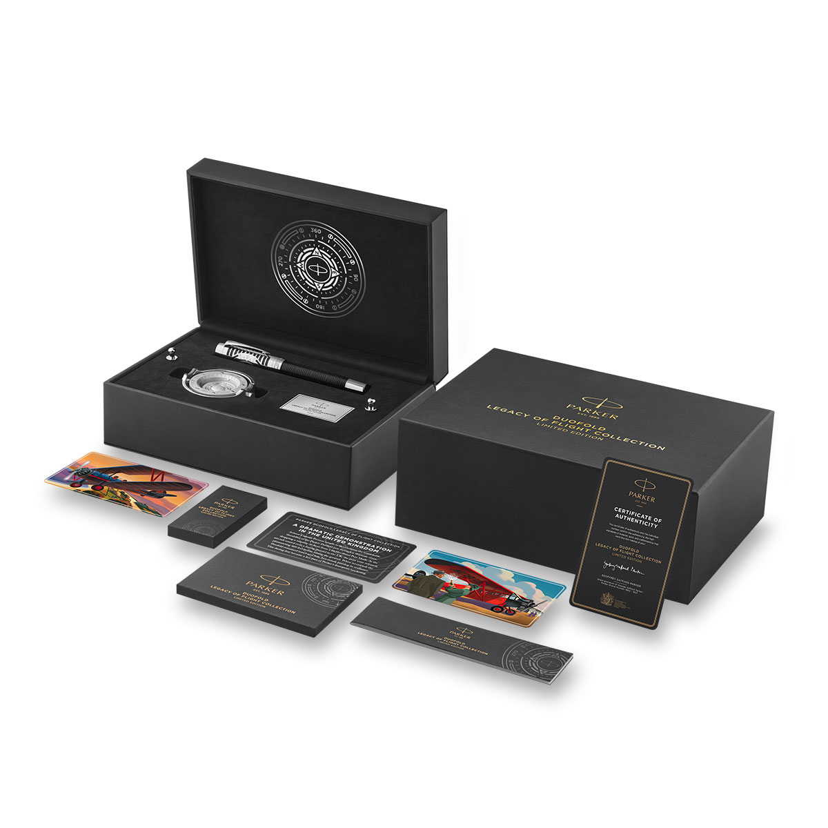 Značka Parker hrdě představuje nádherně vyrobenou limitovanou edici Duofold Legacy of Flight (LE). Každý kus je individuálně číslován a je k dispozici po přísně omezenou dobu. Duofold Legacy of Flight je skutečný sběratelský kousek, vytvořený pro znalce krásného psaní a ty, kteří si cení nejvyšších standardů řemeslného zpracování při výrobě per. Duofold Legacy of Flight je součástí kolekce "Legacy of Flight" – vícerozměrného projektu vzdávající hold silným vazbám společnosti PARKER na letectví, sahajícím až do 20. let - 20. století. Kolekce obsahuje pět nejikoničtějších řad per Parker a zve vás na společnou cestu pod mottem „Naplánujte si svůj kurz“. Kolekce ctí odvážného ducha letectví počátku 20. století – sílu, která formovala vizi a historii PARKERu. Právě tento duch inspiroval odvahu a inovaci v podnikatelském letu k novým teritoriím a světu krásného psaní, stejně jako odvážné propagační kampaně zahrnující letadla v typických barvách PARKERu. Jednou z prvních propagačních iniciativ pro pero Duofold ve 20. letech 20. století byl nákup letadla Fairchild FC-2W2, jehož charakteristický červenočerný livrej dokonale doplňoval design pera. Během cesty po Spojených státech předvedl PARKER velkolepou demonstraci odolnosti per Duofold - pera byla shazována z výšky 1 kilometru, čímž prokázala svou odolnost a posílila image značky jako moderní a odvážná. Letadlo pokřtila Amelia Earhartová jako „Parker Duofold“. Pero se skládá z 23 jednotlivých komponentů, které jsou pečlivě ručně sestaveny s maximální přesností. Mosazná konstrukce s palladiovým povlakem na pozadí lesklé černé pryskyřice je doplněna černými chromovými povrchy, které evokují estetiku raných navigačních přístrojů a lesklé odkryté konstrukce a vrtule historických letadel. Ručně sestavený, dvoubarevný hrot z 18karátového zlata, rhodiovaný a gravírovaný leteckými symboly. Šroubovací víčko s leptaným vzorem magnetického kompasu. Reliéfní znak Parkerova prvního letadla – jednoplošníku Fairchild z roku 1928 na čele víčka. Dodáváno v exkluzivním boxu společně s bombičkami a konvertorem, stojánkem na pero v podobě leteckého kompasu, certifikátem pravosti PARKER, 5x letecká kartička s příběhem "Legacy of Flight" a kovovou destičkou s unikátním číslem limitované edice. Vyrobeno ve Francii.